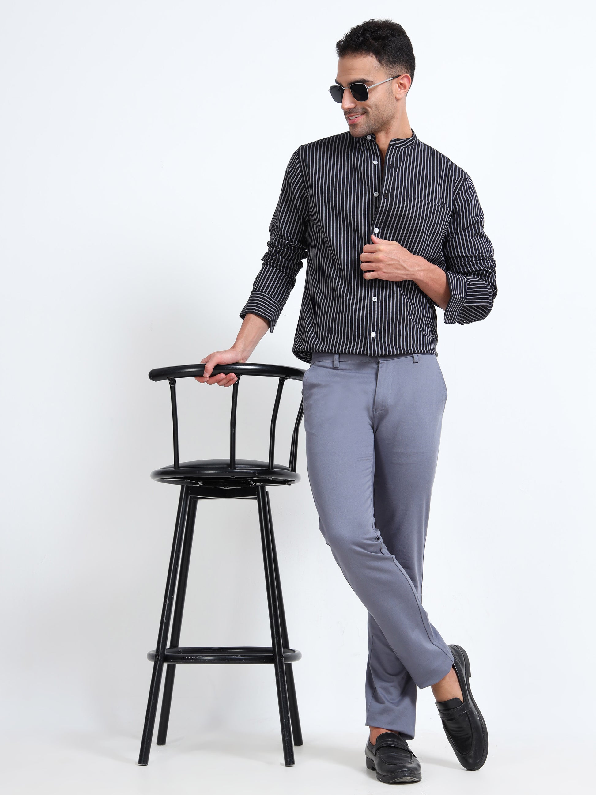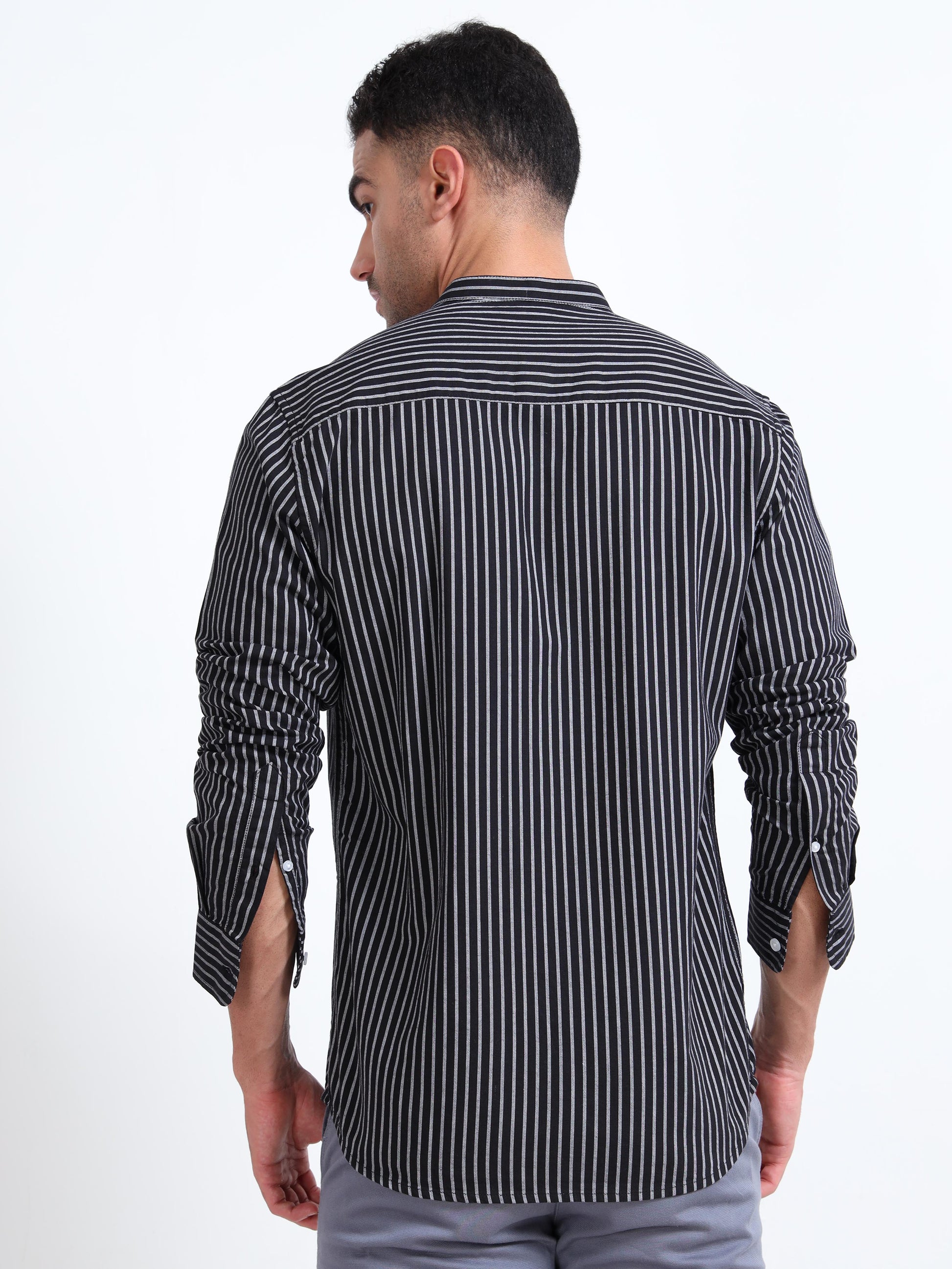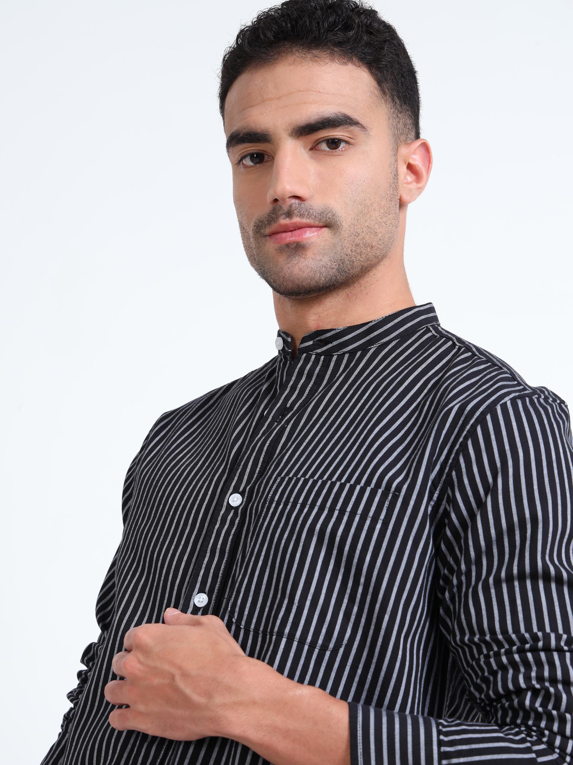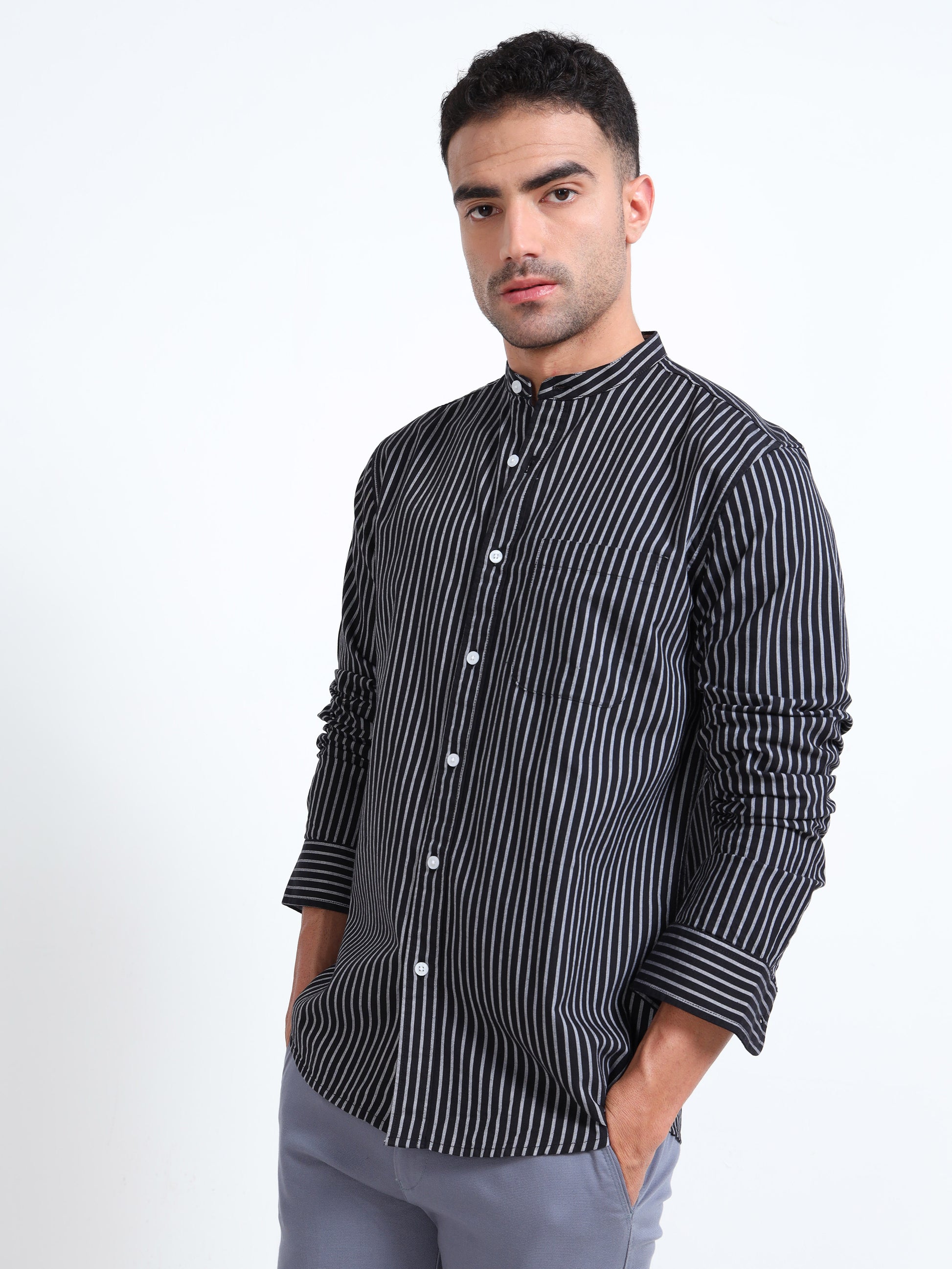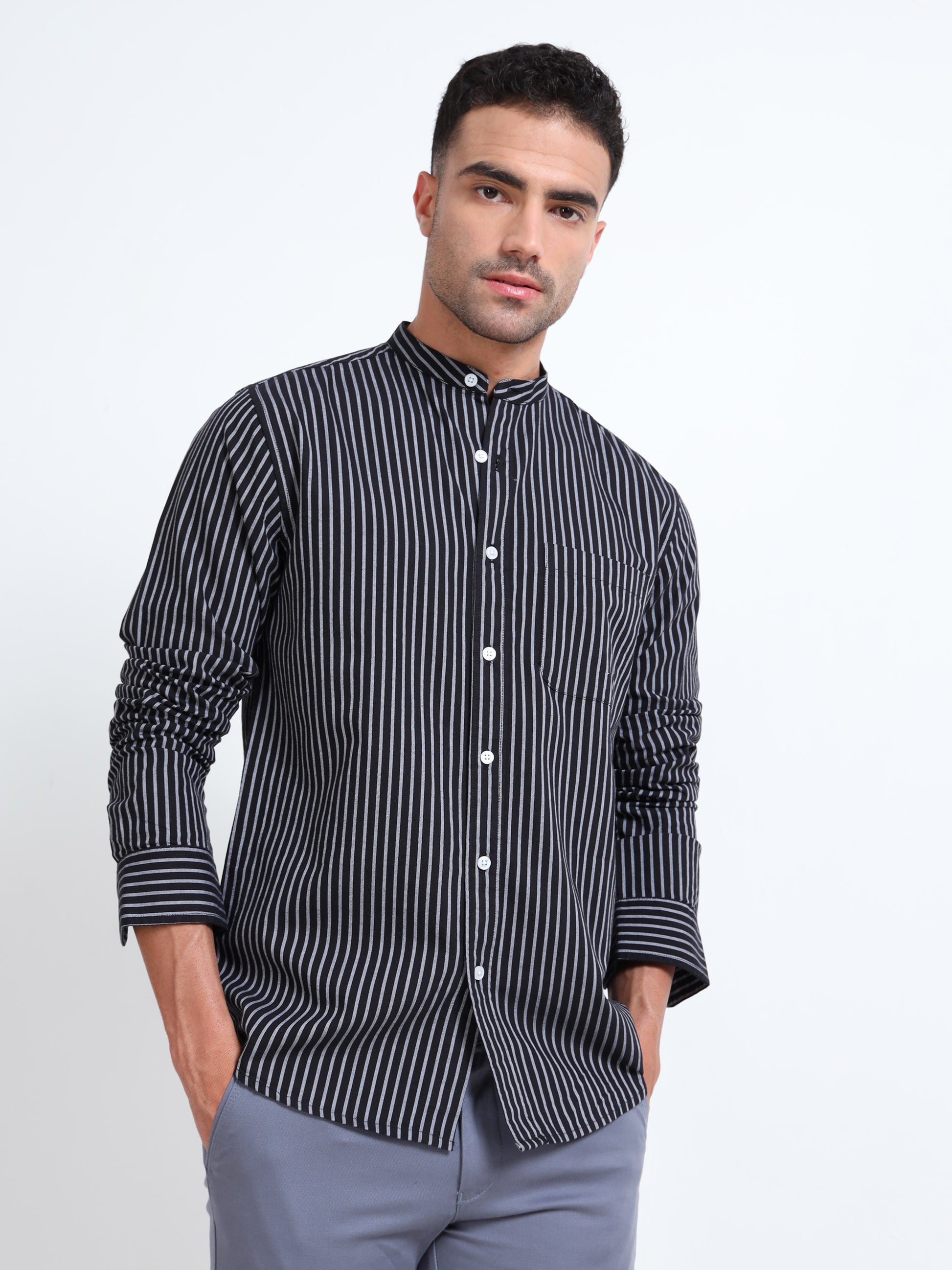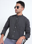 MANDARIN COLLAR YARN DYED OXFORD BLACK STRIPED SHIRT
