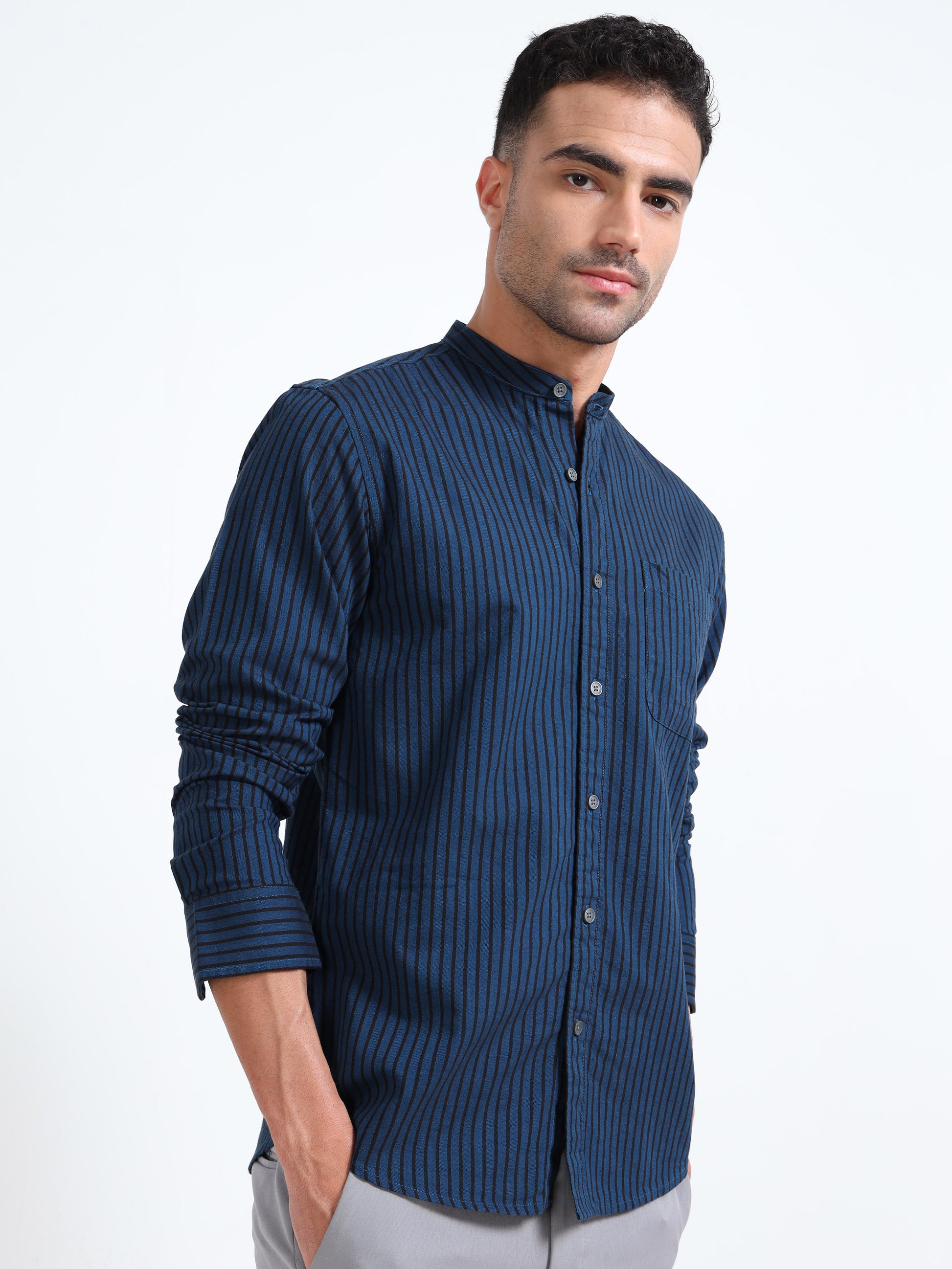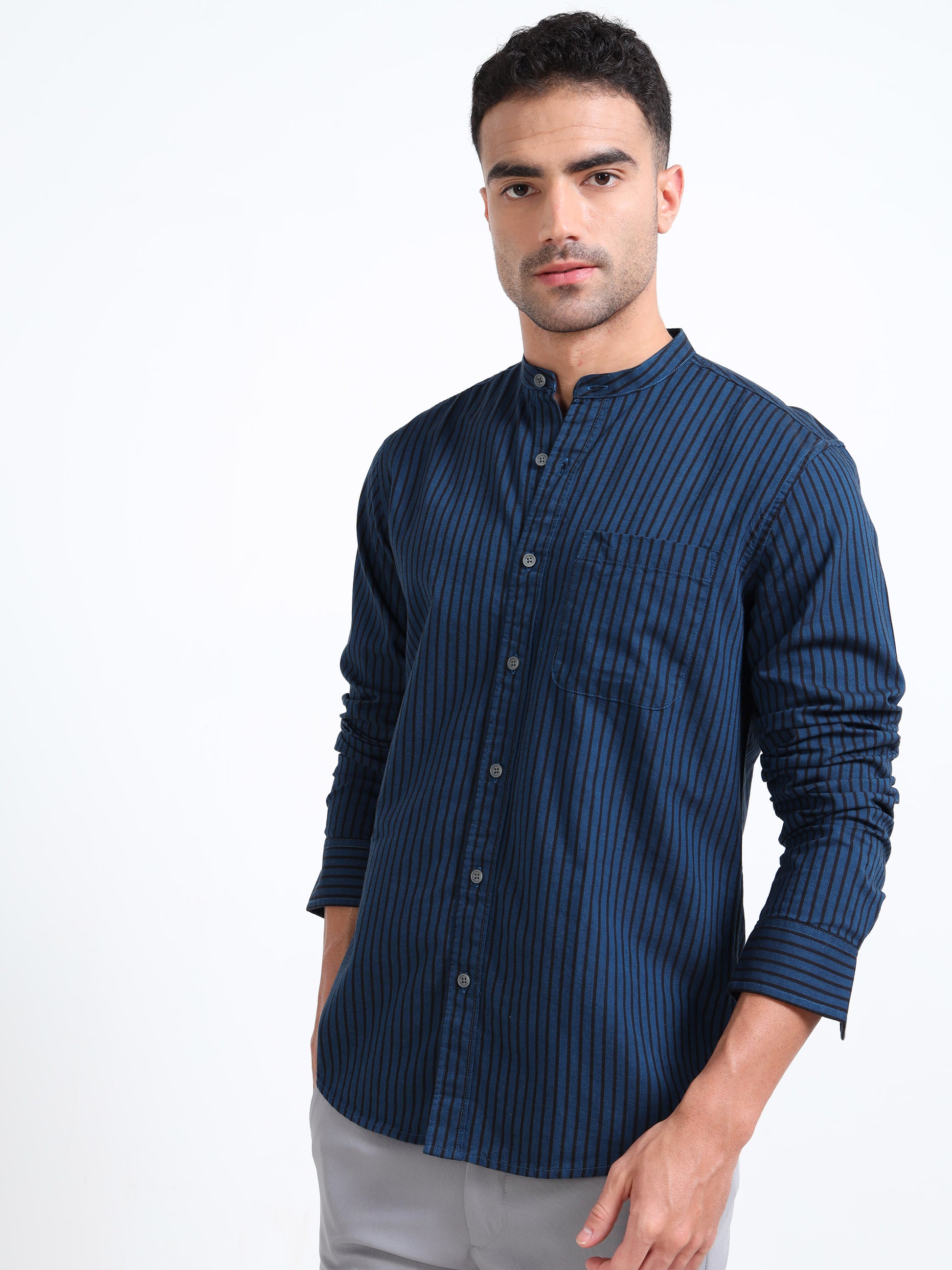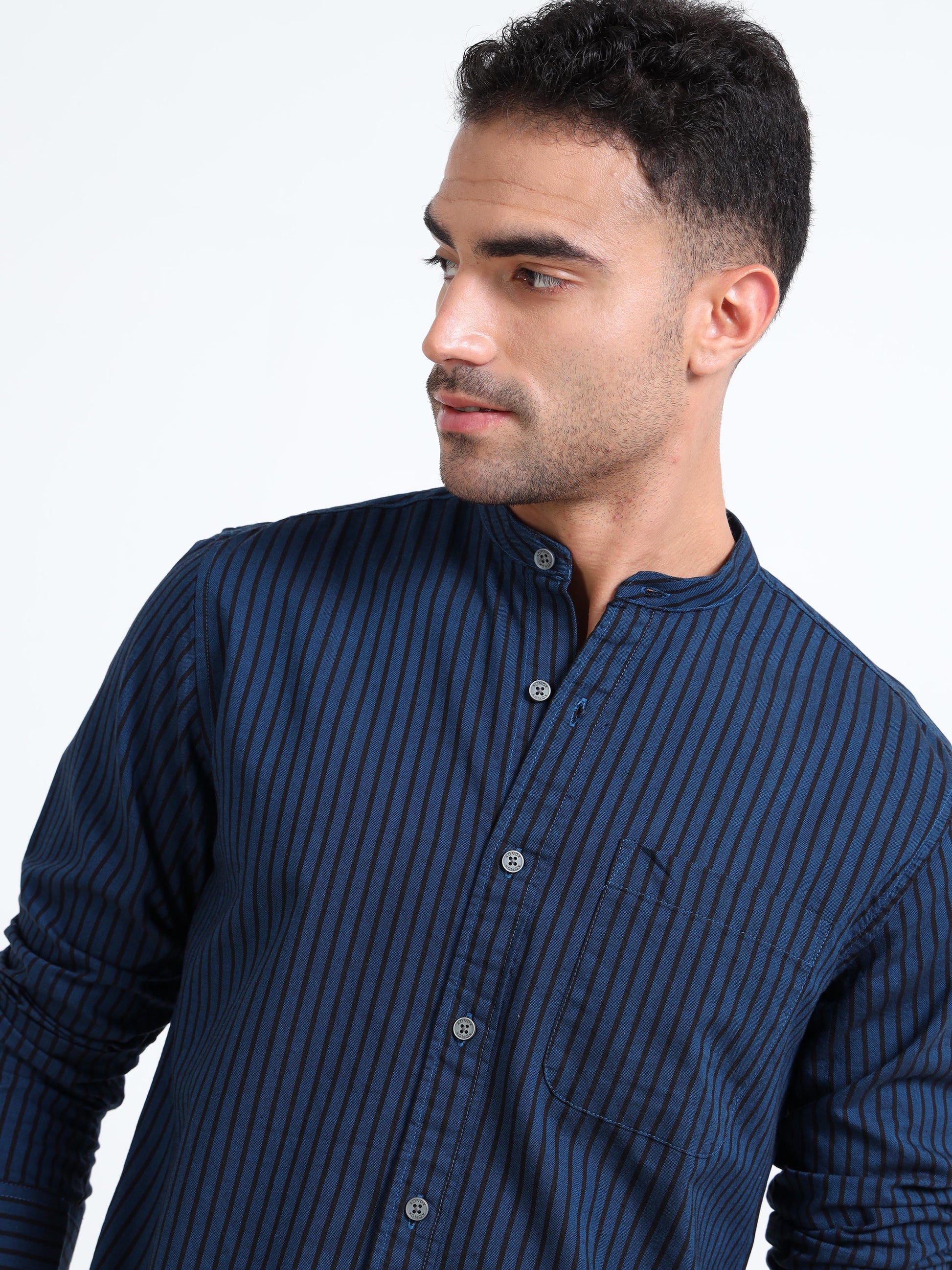 MANDARIN COLLAR YARN DYED OXFORD BLUE STRIPED SHIRT