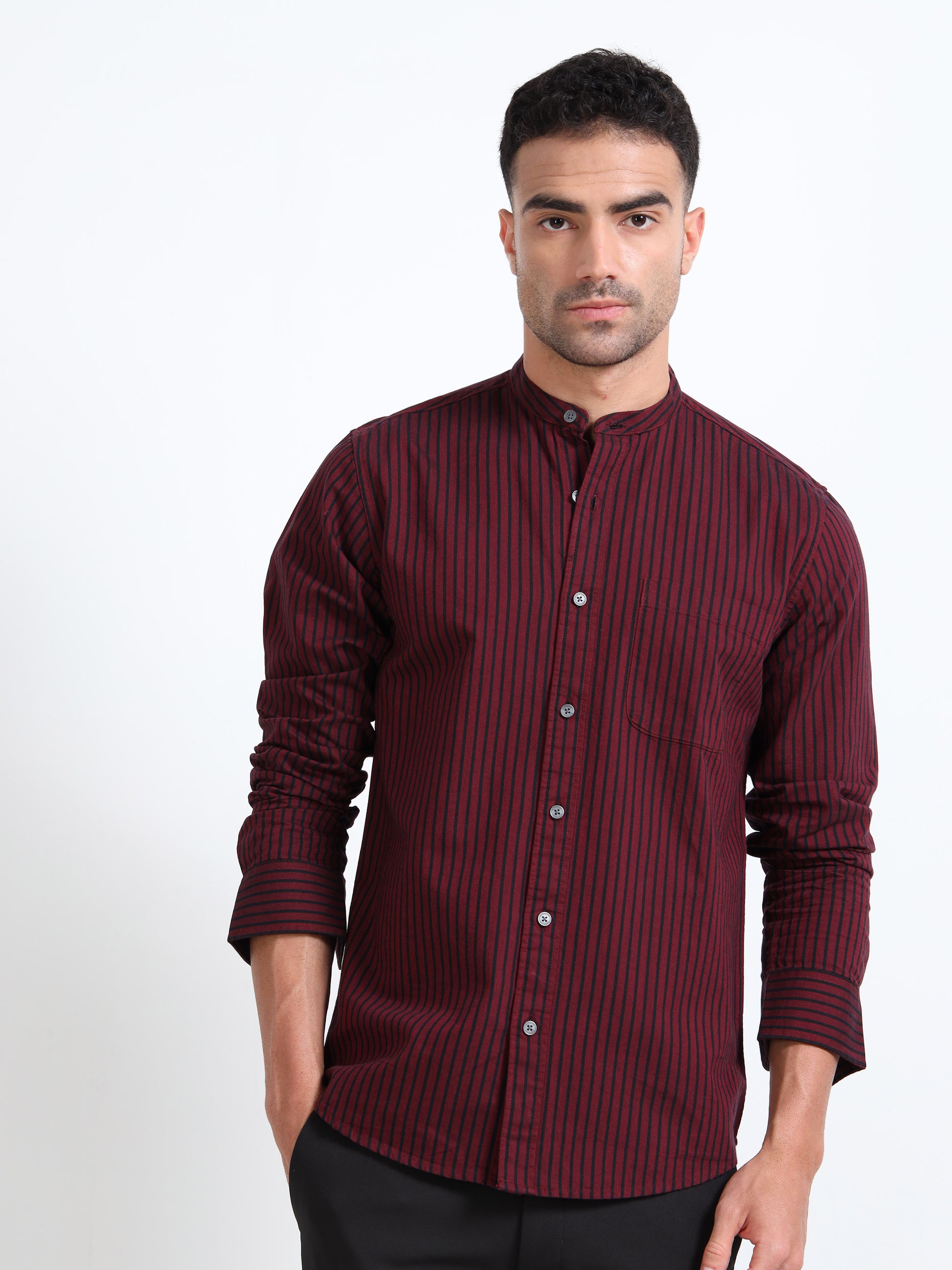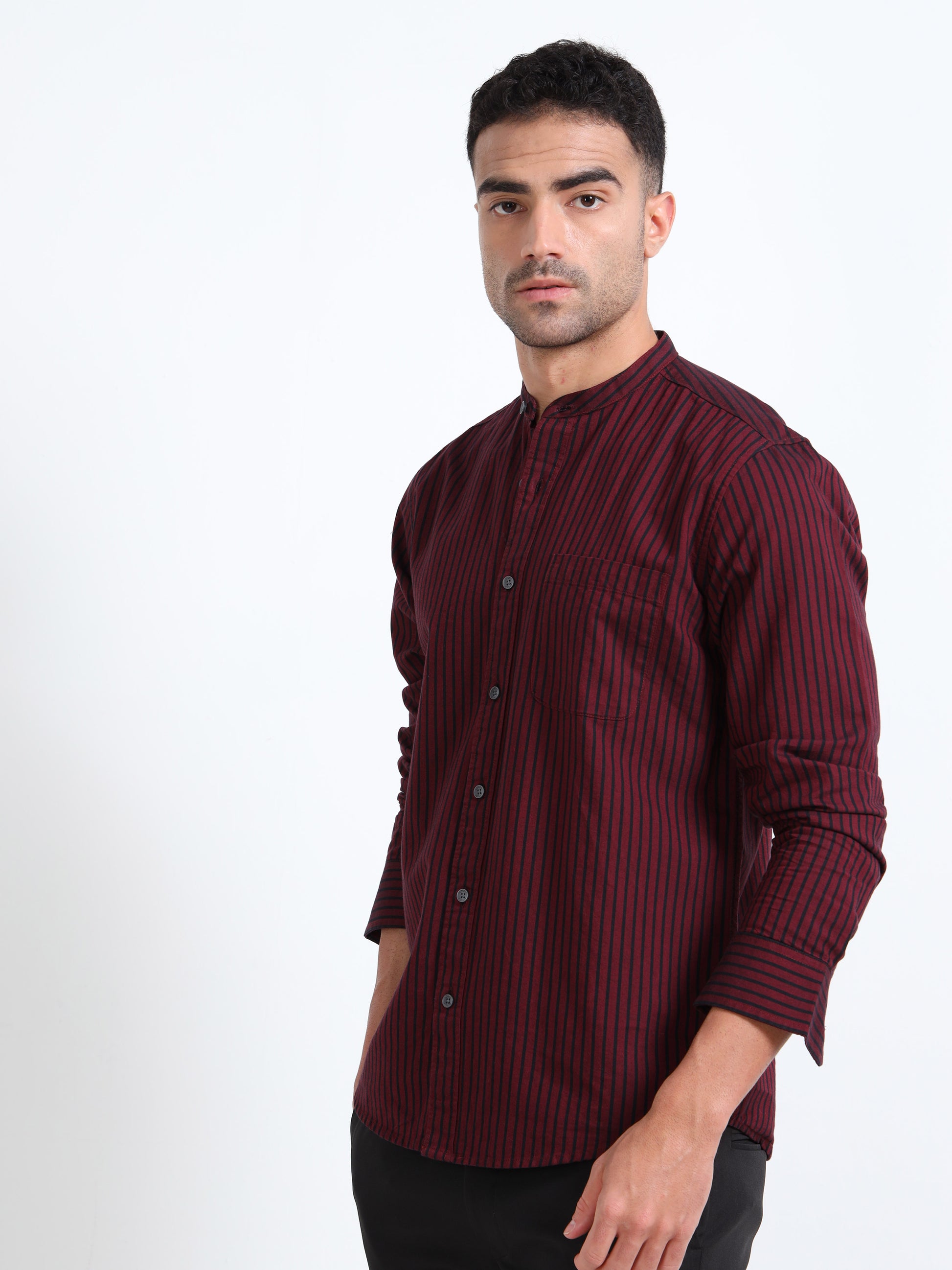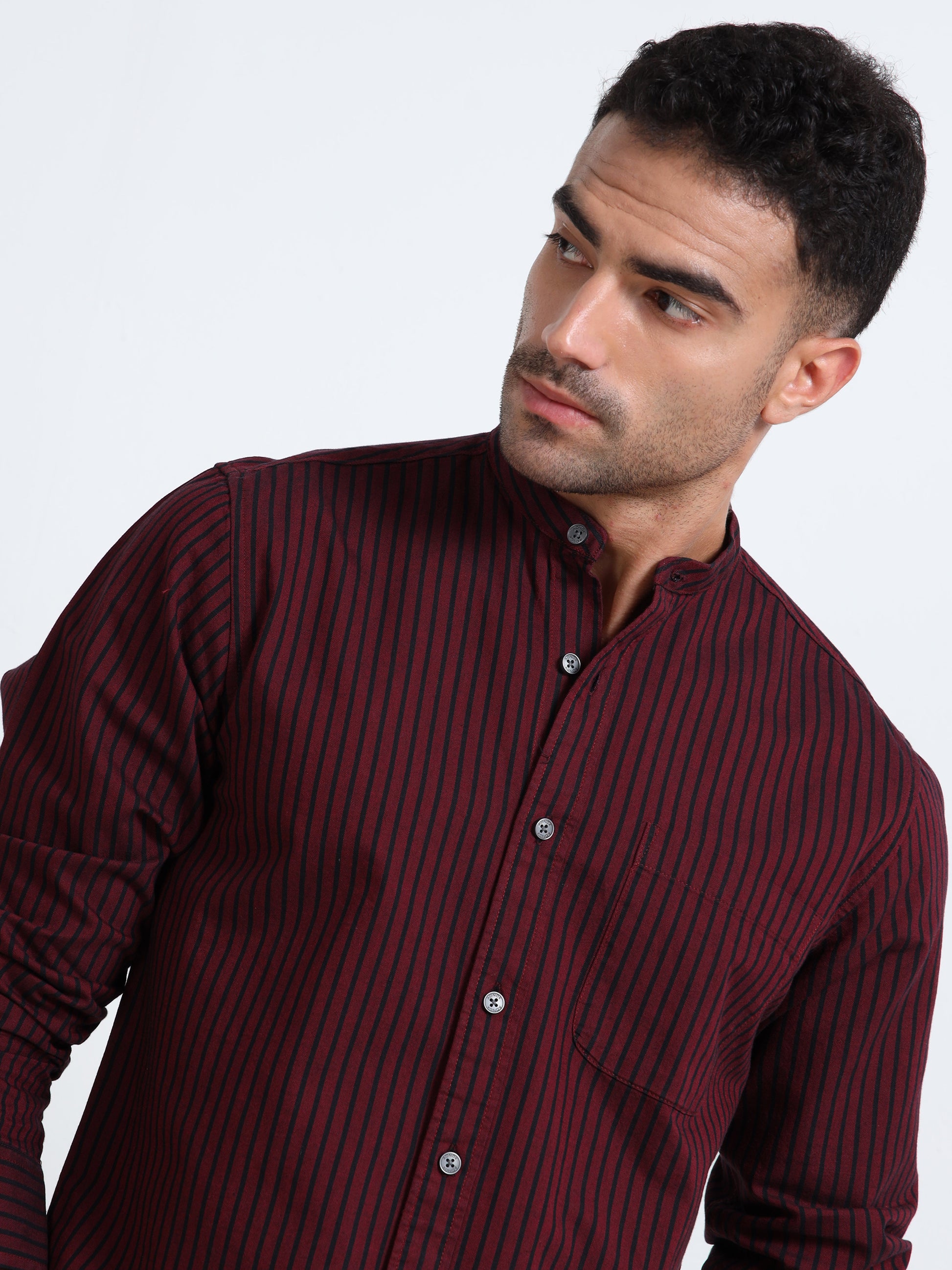 MANDARIN COLLAR YARN DYED OXFORD MAROON STRIPED SHIRT