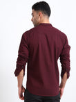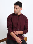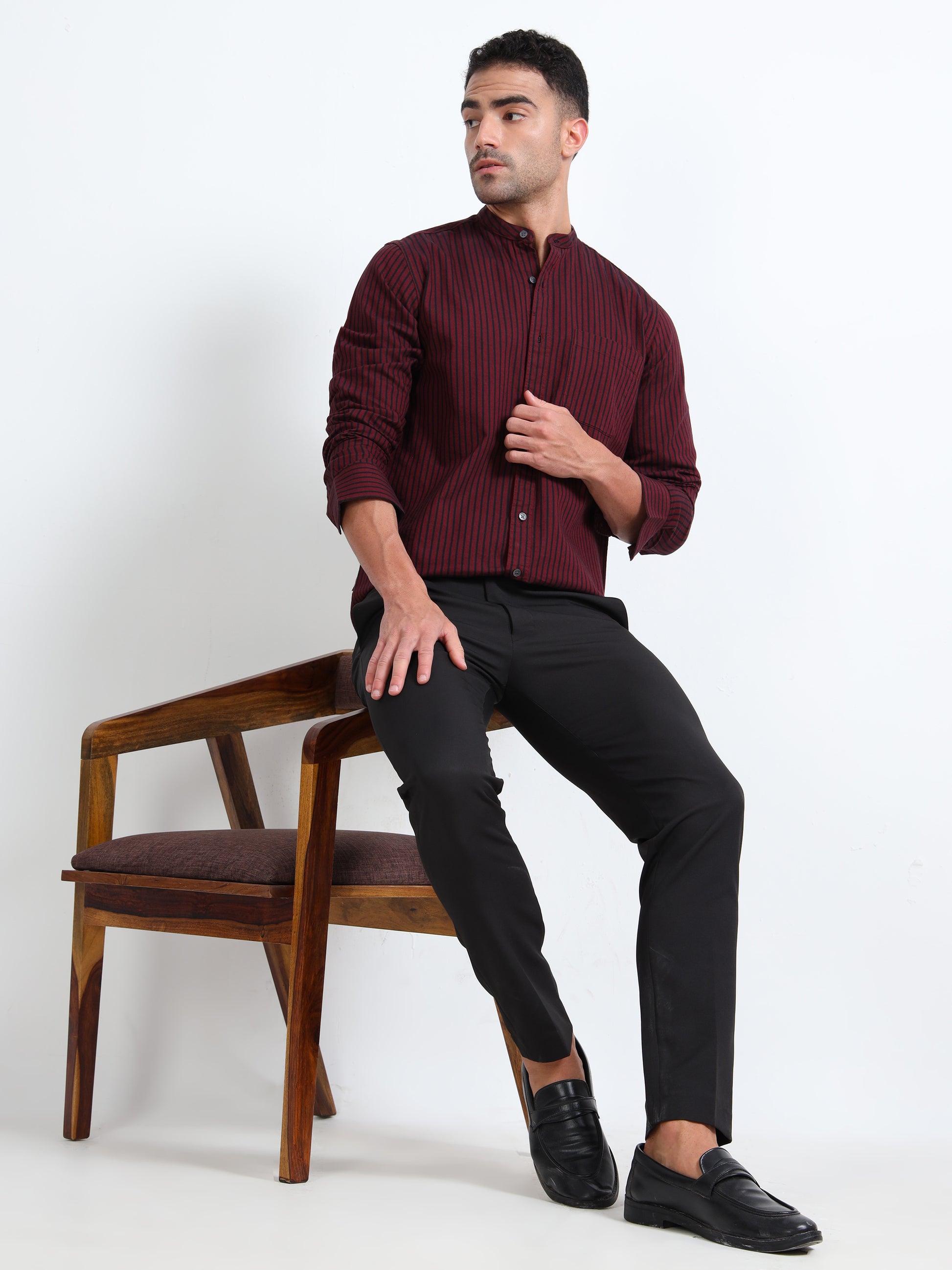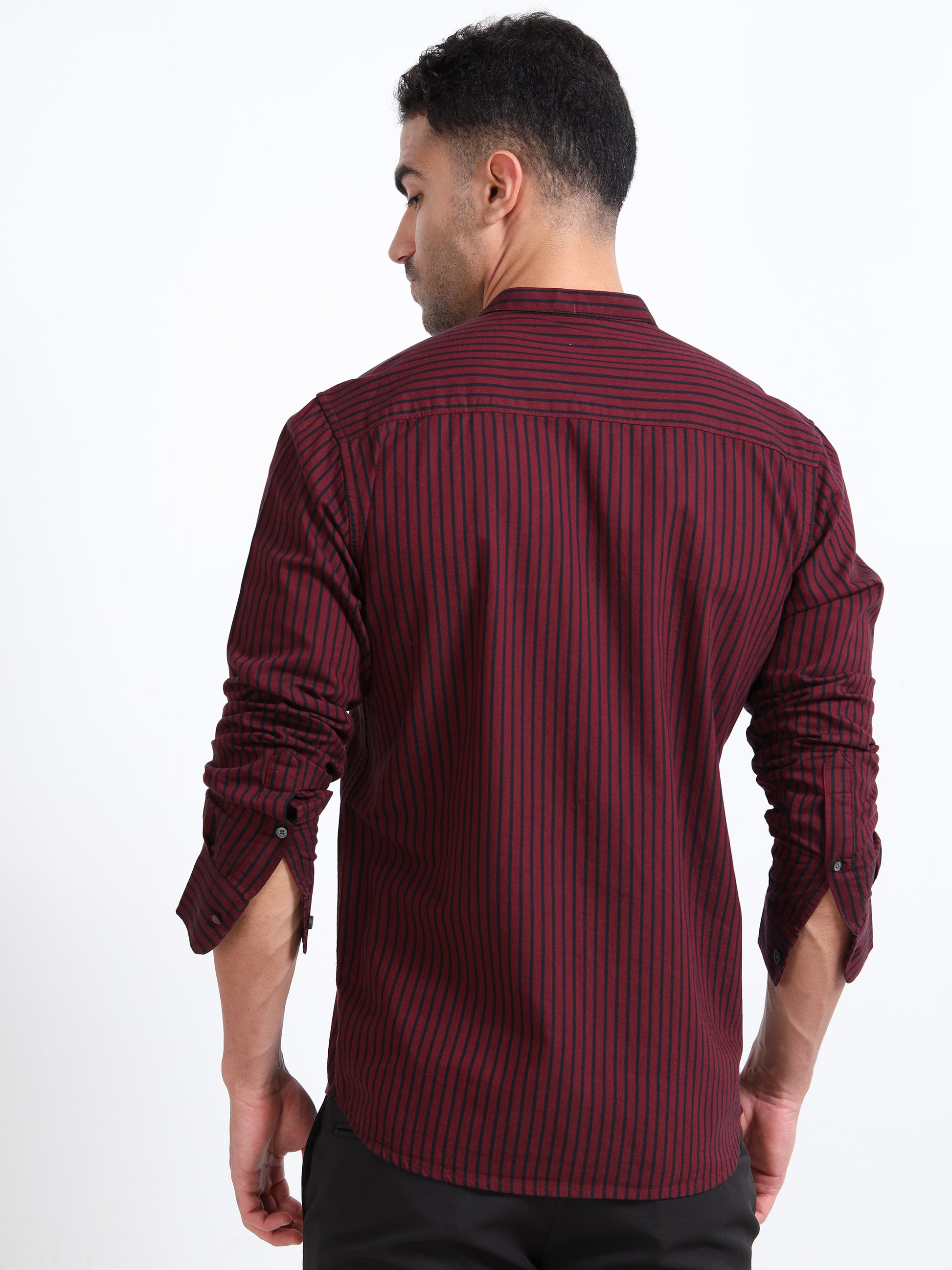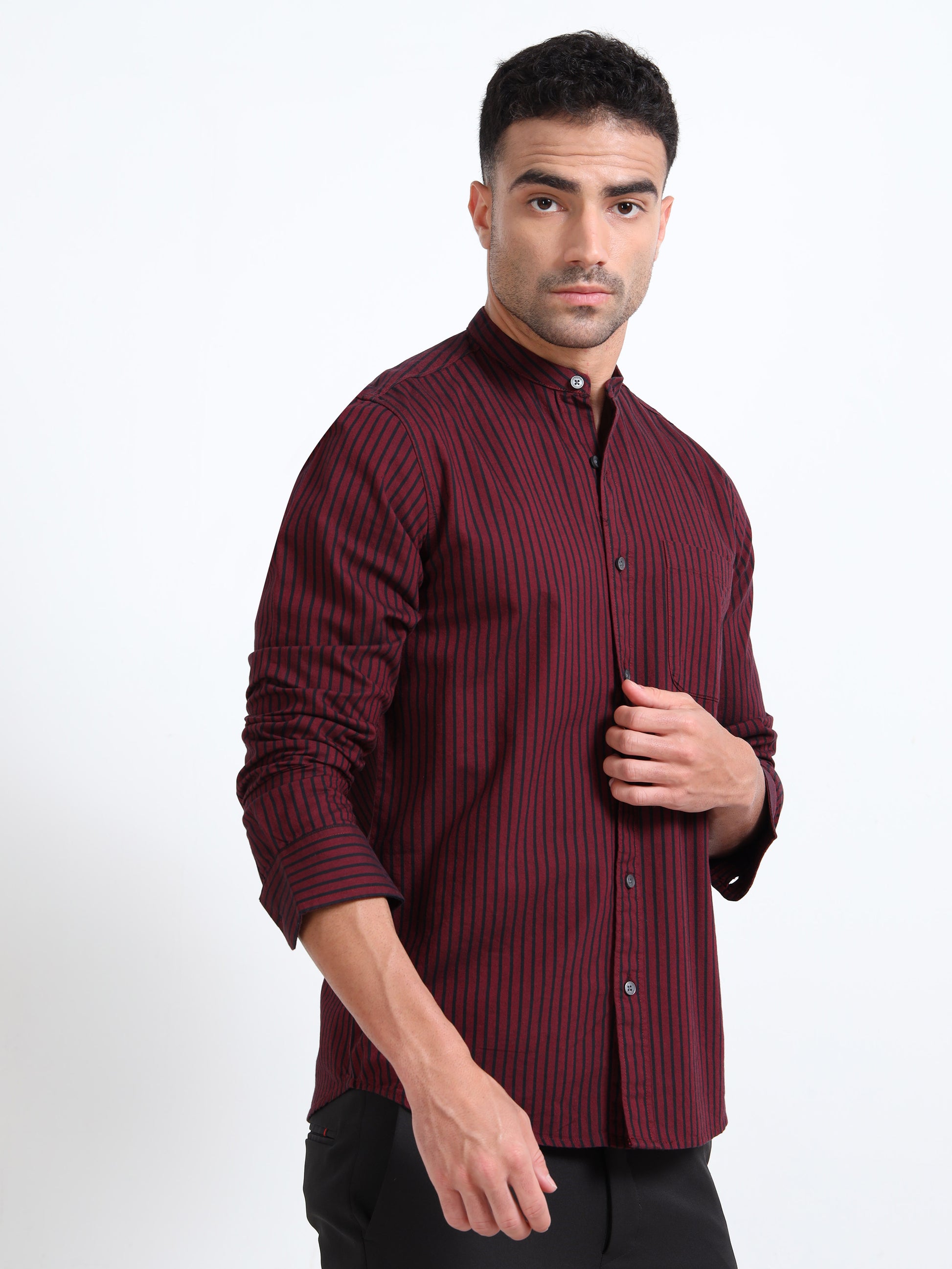 MANDARIN COLLAR YARN DYED OXFORD MAROON STRIPED SHIRT